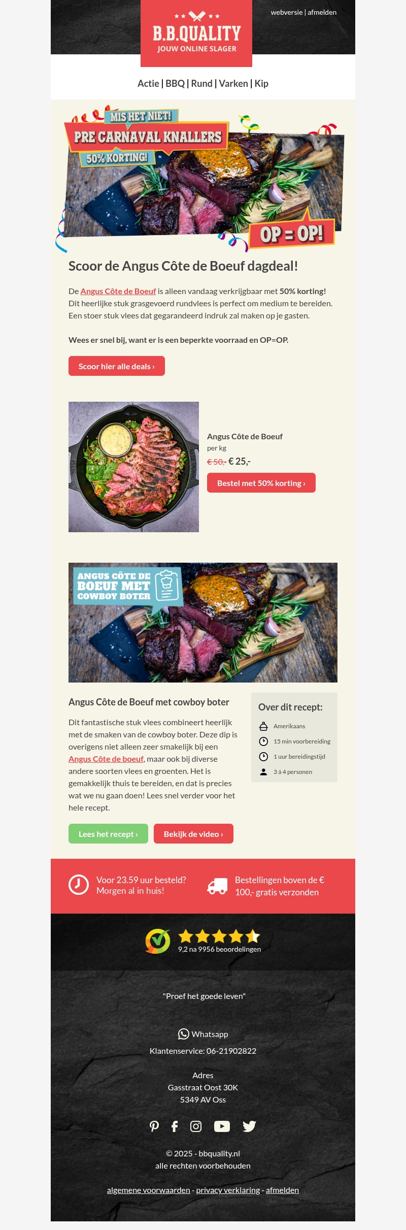 Mis de Pre-Carnaval-Knaller niet met 50% korting op de heerlijke Angus Côte de Boeuf. Perfect voor een smakelijke maaltijd met familie of vrienden. Wees er snel bij, want op is op!