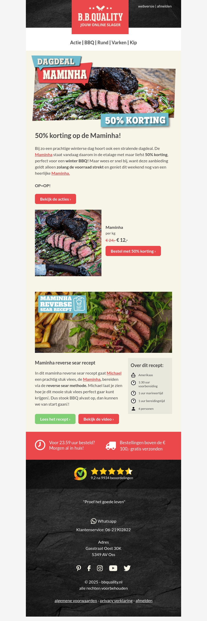 B.B. Quality biedt vandaag een speciale dagdeal aan met 50% korting op de Maminha. Dit smakelijke stuk vlees is ideaal voor een winter BBQ. Wees er snel bij, want deze aanbieding geldt zolang de voorraad strekt. Ontdek de bereidingswijze en geniet van een heerlijke maaltijd. Shop nu voor deze geweldige deal.