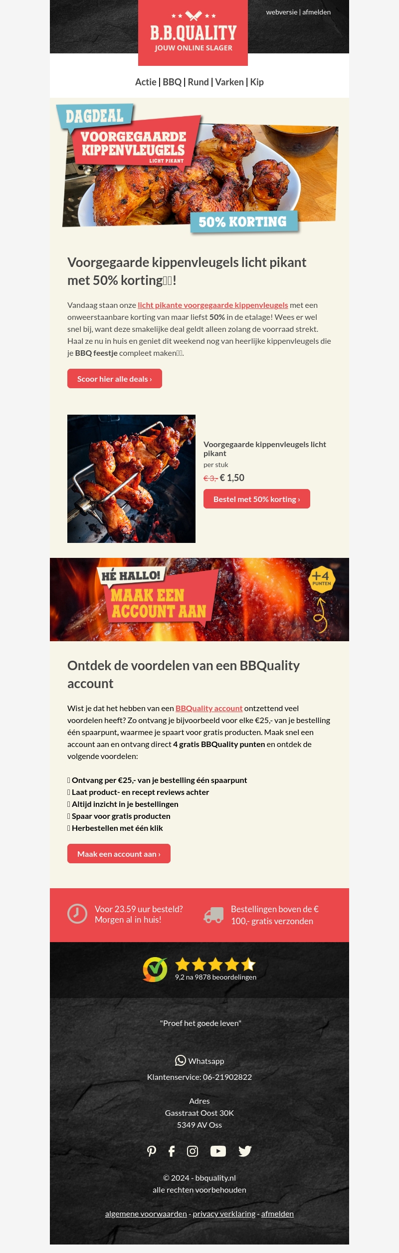 Profiteer van een smakelijke dagdeal met 50% korting op onze licht pikante voorgegaarde kippenvleugels. Ideaal om je BBQ-feestje compleet te maken. Wees er snel bij, want de voorraad is beperkt!