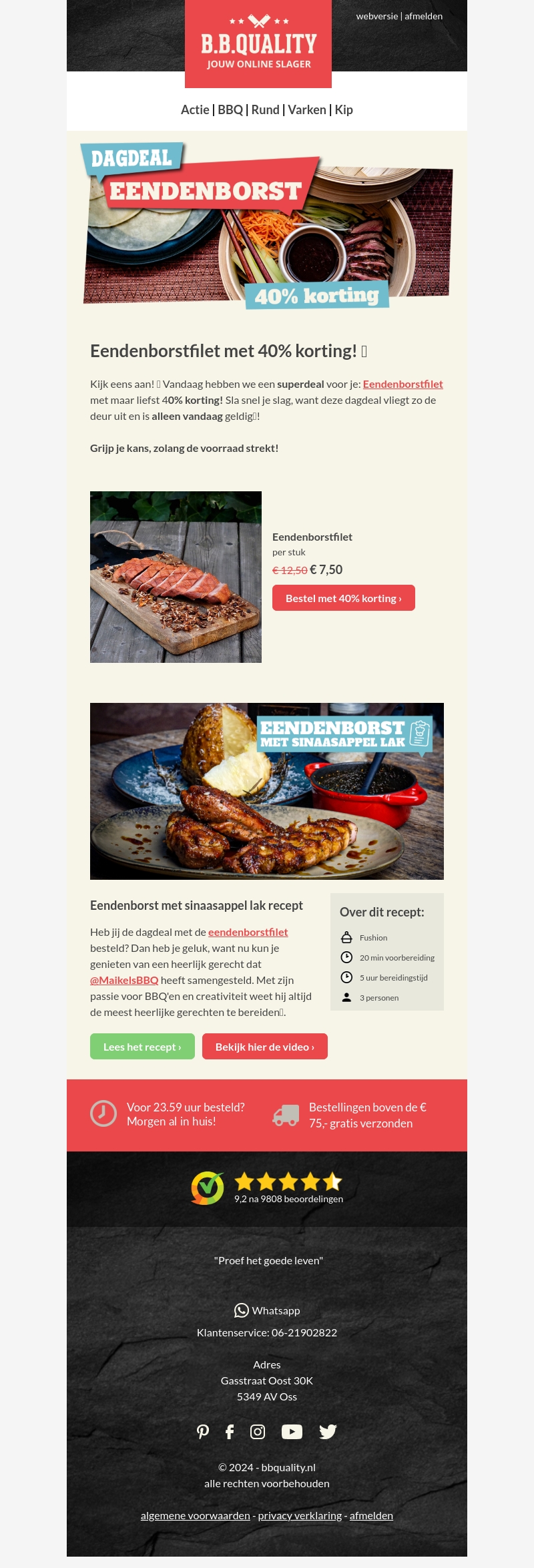 Kijk eens aan! Vandaag hebben we een superdeal voor je: Eendenborstfilet met maar liefst 40% korting! Sla snel je slag, want deze dagdeal vliegt zo de deur uit en is alleen vandaag geldig! Grijp je kans, zolang de voorraad strekt!