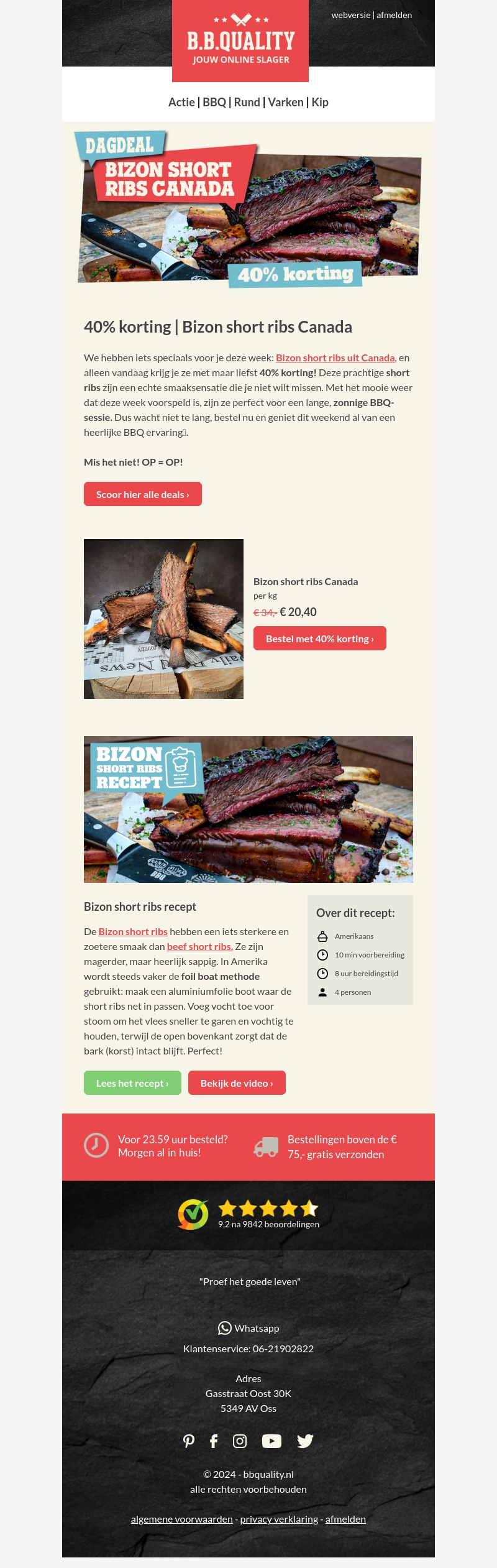 Deze week hebben we iets speciaals voor je: Bizon short ribs uit Canada met maar liefst 40% korting! Deze sappige ribs zijn perfect voor een zonnige BBQ. Bestel nu en geniet van een heerlijke BBQ-ervaring. OP = OP!
