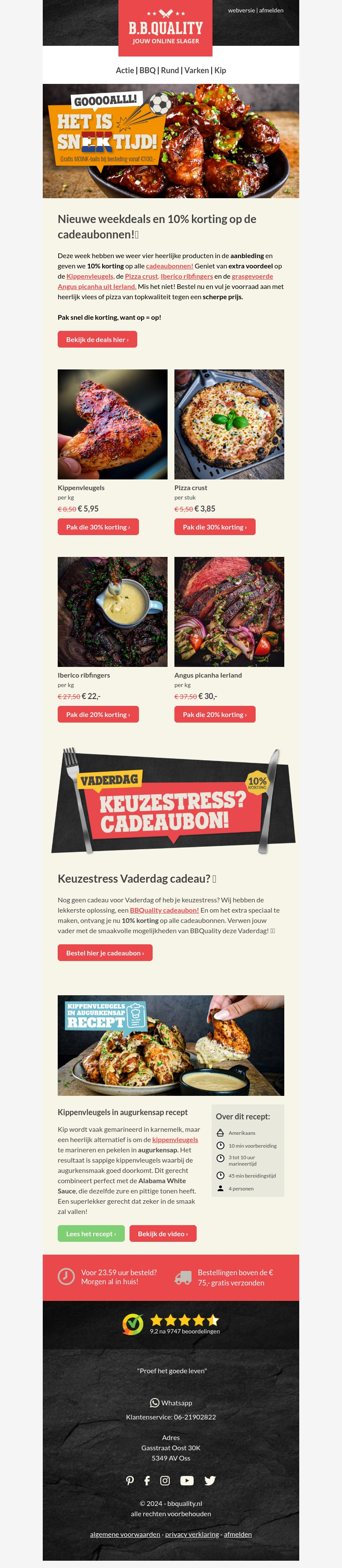 Deze week biedt B.B. Quality heerlijke aanbiedingen, inclusief 10% korting op cadeaubonnen. Geniet van kippenvleugels, pizza crust, iberico ribfingers en meer met scherpe kortingen. Mis het niet!