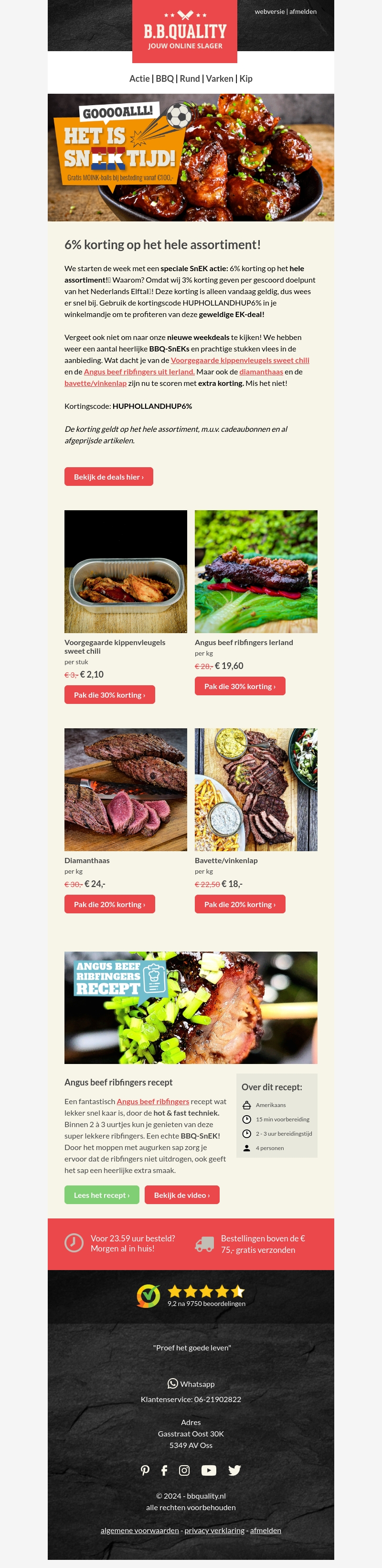 Deze week starten we met een speciale actie: 6% korting op het hele assortiment met de code HUPHOLLANDHUP6%. Profiteer van nieuwe weekdeals en geniet van heerlijke BBQ-snacks en vleesproducten met kortingen tot 30%. Mis deze kans niet om extra te besparen!