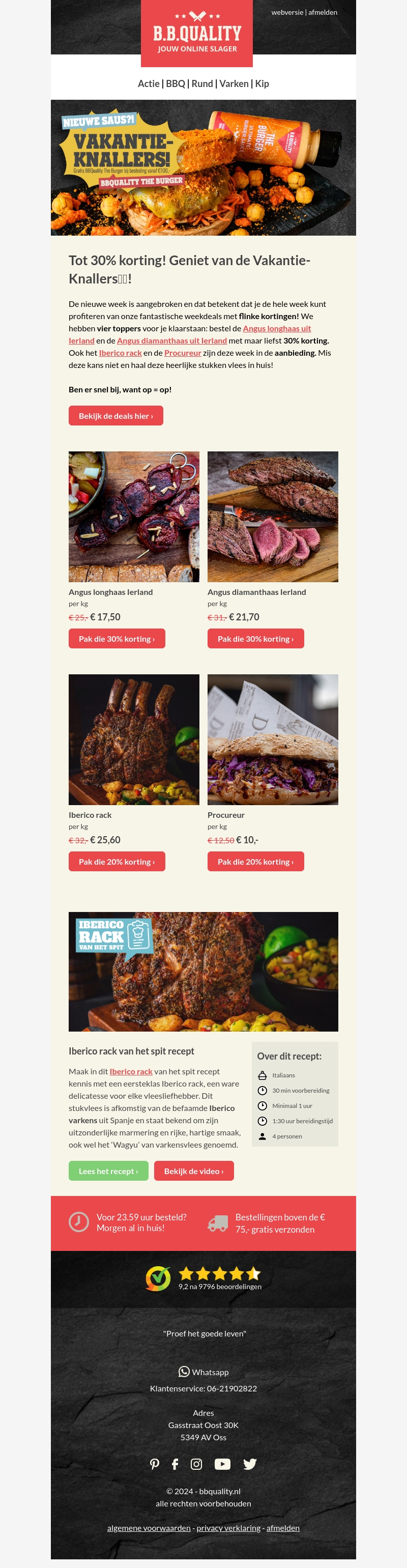 De nieuwe week is aangebroken en dat betekent dat je de hele week kunt profiteren van onze fantastische weekdeals met flinke kortingen! We hebben vier toppers voor je klaargestaan: bestel de Angus longhaas uit Ierland en de Angus diamanthaas uit Ierland met maar liefst 30% korting. Ook het Iberico rack en de Procureur zijn deze week in de aanbieding. Mis deze kans niet en haal deze heerlijke stukken vlees in huis!
