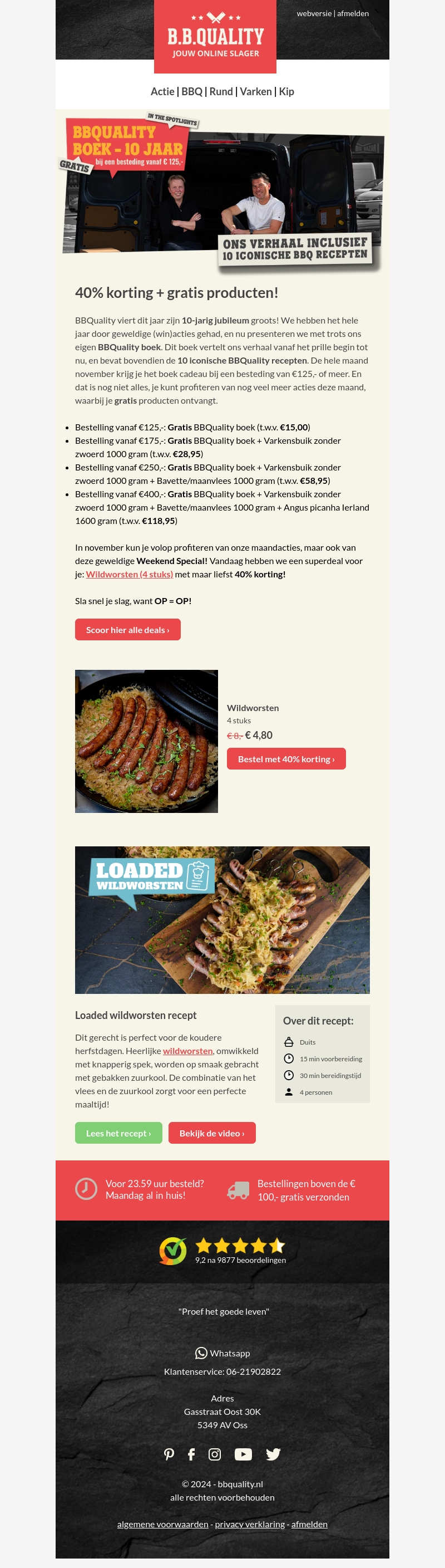 BBQuality viert zijn 10-jarig jubileum met spectaculaire aanbiedingen. Bestellingen vanaf €125,- krijgen een gratis BBQuality boek en meer. Profiteer van de maandacties en speciale aanbiedingen. Vandaag is er 40% korting op wildworsten als Weekend Special. Ontdek heerlijke recepten en geniet van het beste vlees voor jouw BBQ.