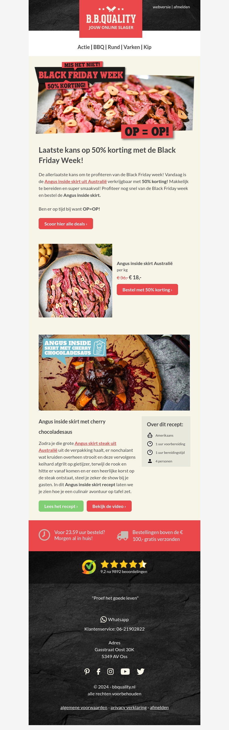 Proef de onweerstaanbare smaak van Angus inside skirt met 50% korting tijdens Black Friday Week. Perfect voor een smaakvolle en makkelijke bereiding. Wacht niet langer, want OP=OP! Haal het beste uit je gerechten en geniet van deze exclusieve aanbieding bij B.B. Quality.