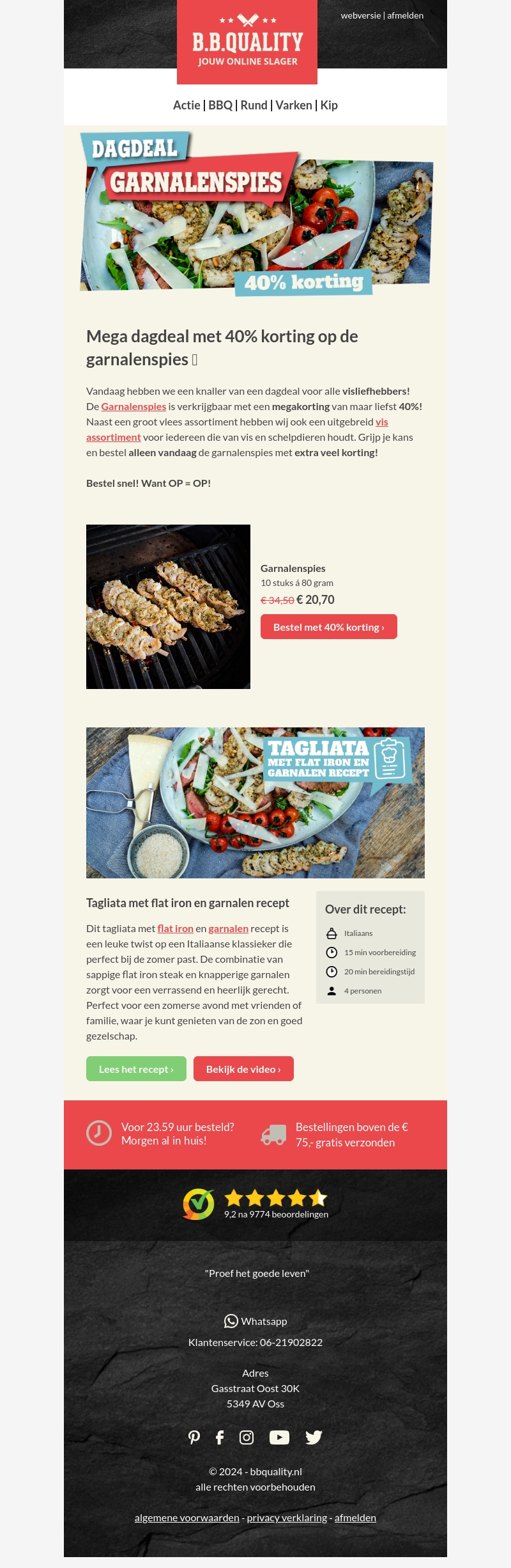 Grijp je kans met de mega dagdeal van BBQuality: 40% korting op garnalenspies! Deze aanbieding is speciaal voor alle visliefhebbers die houden van smaakvolle en sappige gerechten. Mis het niet en bestel vandaag nog jouw garnalenspies met extra veel korting. OP=OP, dus wees er snel bij!