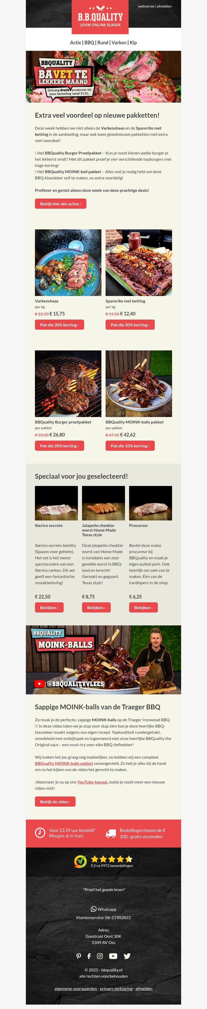 Deze week biedt B.B.Quality heerlijke nieuwe vleesaanbiedingen met extra voordeel. Profiteer van de speciale prijzen op varkenshaas en spareribs, en ontdek het exclusieve BBQuality Burger Proefpakket. Mis de sappige MOINK-balls van de Traeger BBQ niet, heerlijk bereid voor elke BBQ-liefhebber. Bekijk onze video voor exclusieve recepten en inspiratie. Bestel nu en geniet morgen al van deze smakelijke deals!