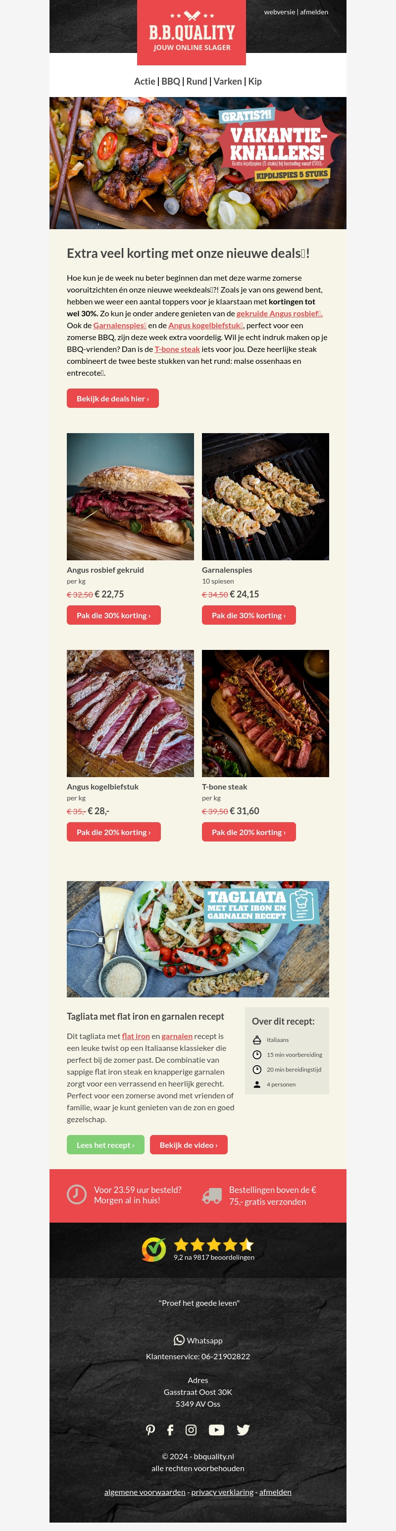 Begin je week goed met de nieuwste weekdeals van B.B. Quality. Krijg tot 30% korting op diverse producten, waaronder gekruide Angus rosbief, garnalenspiesjes en meer. Bekijk de deals en verwen jezelf met onze kwaliteitsvlees.