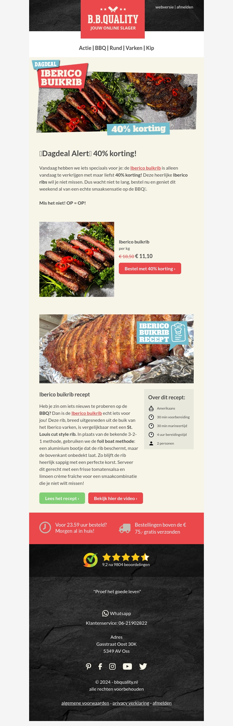Vandaag bij B.B.Quality: 40% korting op de heerlijke Iberico buikrib! Bestel nu en geniet dit weekend al van een echte smaaksensatie op de BBQ. Mis deze kans niet, op=op!