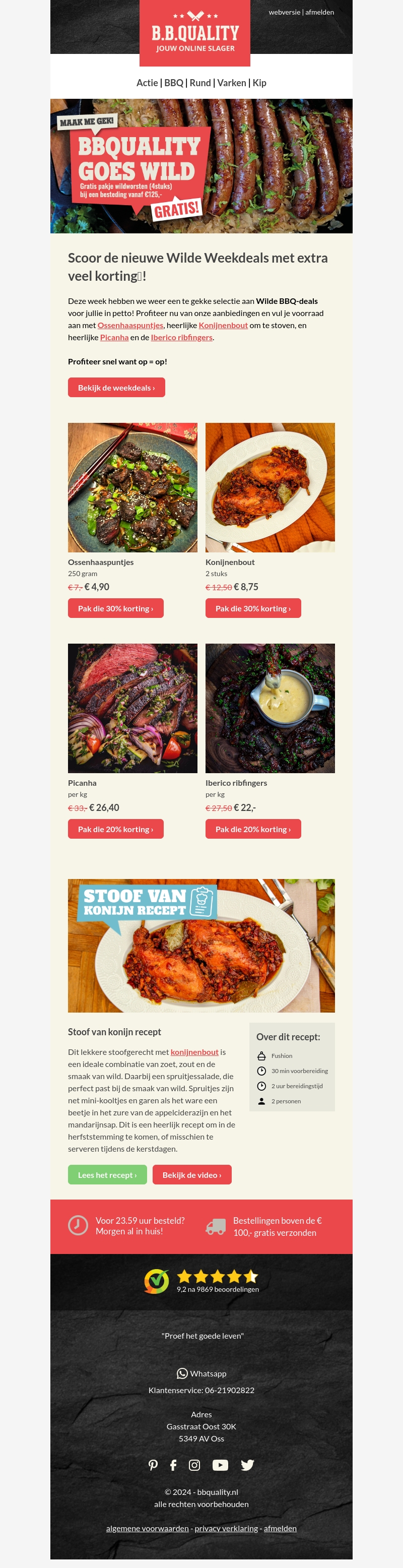 Deze week biedt B.B.Quality een geweldige selectie aan Wilde BBQ-deals. Geniet van ossenhaaspuntjes, konijnenbout, Picanha en Iberico ribfingers met buitengewone kortingen. Ontvang een gratis pakje wildworsten bij een aankoop vanaf €125. Mis deze exclusieve aanbiedingen niet en scoor jouw favoriete vlees!