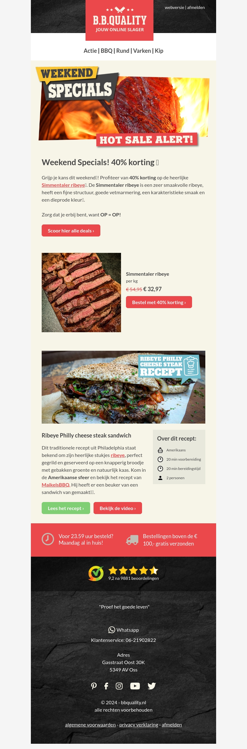 Geniet dit weekend van een speciale aanbieding op de Simmentaler ribeye met maar liefst 40% korting bij B.B.Quality. De ribeye staat bekend om zijn fijne structuur en rijk gevlekte vetmarmering. Verlies jezelf in de karakteristieke smaak en diepe kleur van dit voortreffelijke stuk vlees. Deze unieke kans geldt zolang de voorraad strekt.