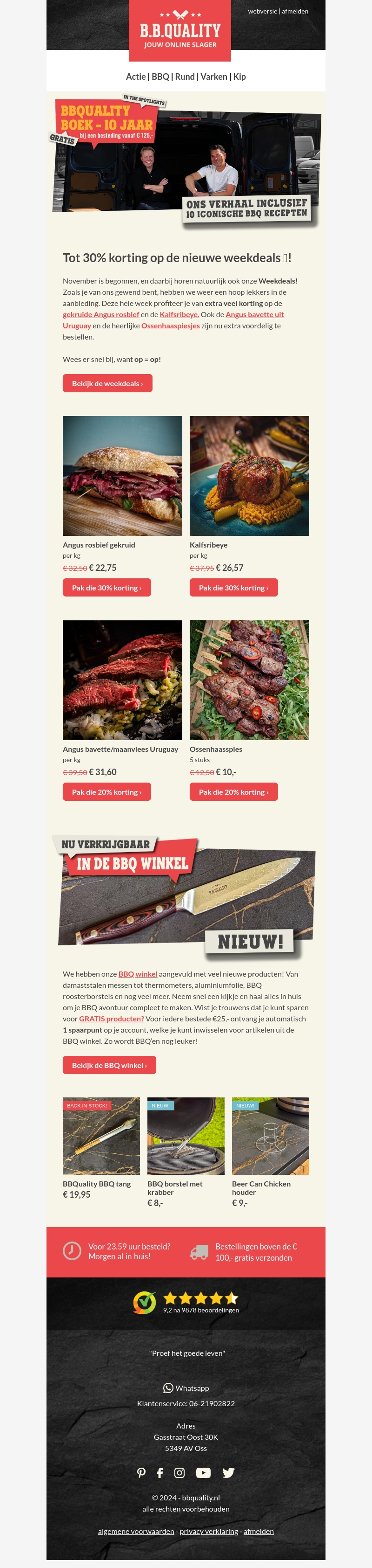 Mis de kans niet om te genieten van de nieuwste weekdeals bij BBQ Quality. Met kortingen tot 30% kun je genieten van hoogwaardig vlees zoals gekruide Angus rosbief en kalfsribeye. Bovendien zijn er nieuwe producten verkrijgbaar in de BBQ winkel, zoals damaststalen messen en BBQ borstels. Deze aanbiedingen zijn tijdelijk, dus wees er snel bij!