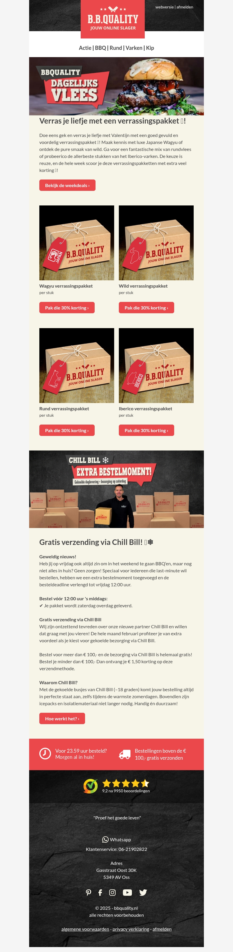 Maak Valentijn speciaal met een BBQQuality verrassingspakket. Kies uit luxe Wagyu, wild, rund of Iberico. Dit weekend extra korting op alle pakketten. Profiteer van gratis verzending bij bestellingen boven de €100.