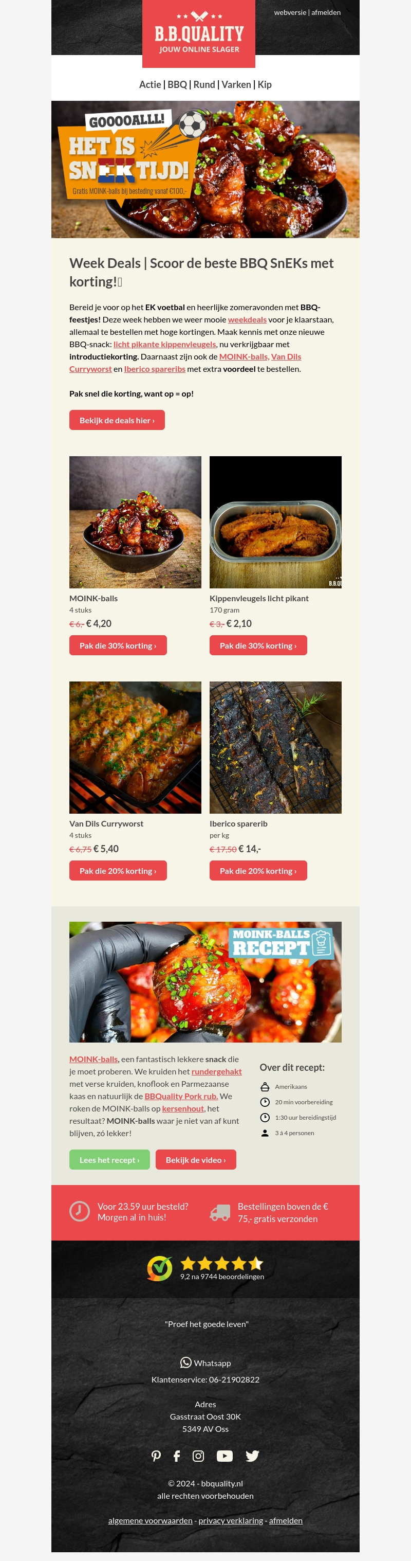 Bereid je voor op het EK voetbal en je zomerse BBQ-feestjes met de weekdeals van B.B.Q. Quality. Maak kennis met onze nieuwe BBQ-snack zoals MOINK-balls, pikante kippenvleugels, Van Dils Curryworst en Iberico spareribs. Profiteer nu van aantrekkelijke kortingen en bestel direct!