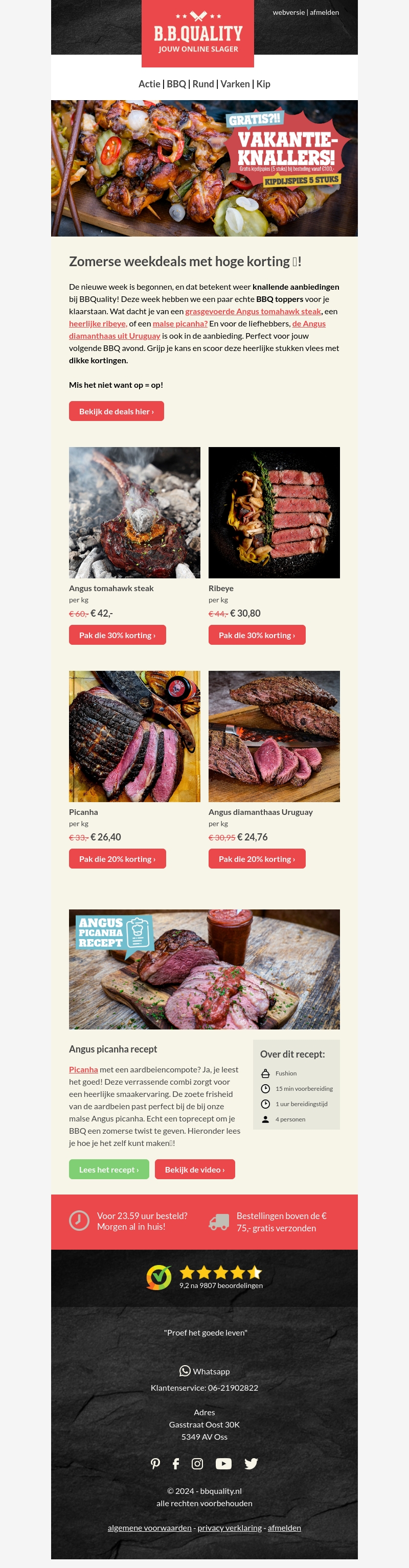 De nieuwe week is begonnen en dat betekent weer knallende aanbiedingen bij BBQuality! Deze week hebben we een paar echte BBQ toppers voor je klaarstaan. Van grasgevoerde Angus tomahawk steak tot heerlijke ribeye en nog veel meer.