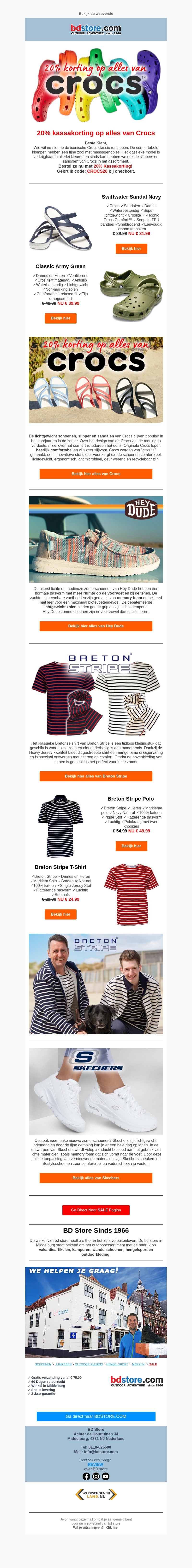Ontvang 20% kassakorting op alle Crocs bij BD Store! Bekijk de nieuwste modellen en sla je slag met deze geweldige aanbieding. Gebruik de couponcode CROCS20 bij het afrekenen om van de korting te profiteren. Mis het niet!