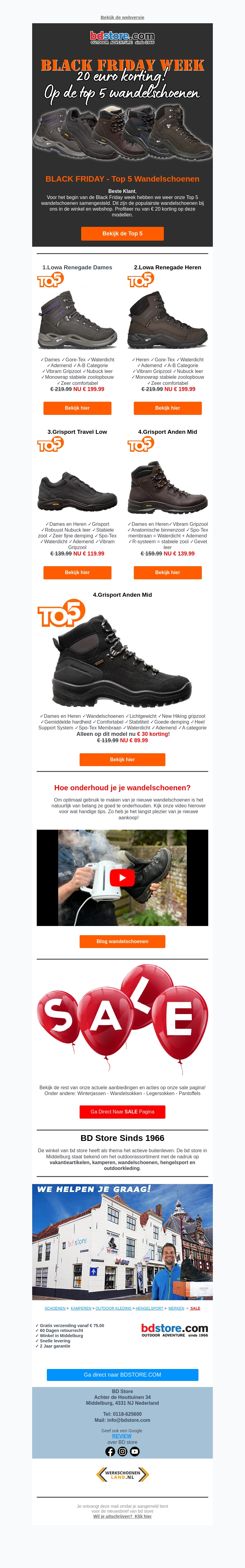 Zorg dat je klaar bent voor je volgende avontuur met de top 5 wandelschoenen van deze Black Friday week. Ontvang €20 korting op merken zoals Lowa en Grisport. Mis deze kans niet op hoogwaardige trekking- en outdoorschoenen voor zowel dames als heren. In deze nieuwsbrief vind je ook tips voor het onderhoud van je wandelschoenen. Ontdek nu de beste deals en acties op onze website!