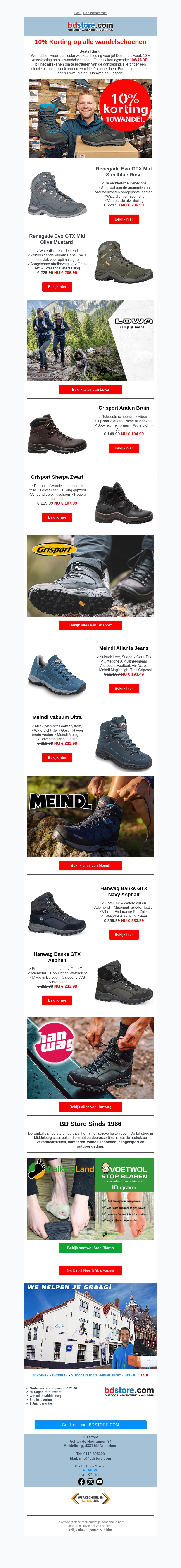 Deze week krijg je 10% kassakorting op alle wandelschoenen bij BD Store. Ontdek onze uitgebreide collectie van topmerken zoals Lowa, Hanwag en Meindl. Wees klaar voor je volgende avontuur met de beste wandelschoenen. Mis deze kans niet, de actie is maar tijdelijk!