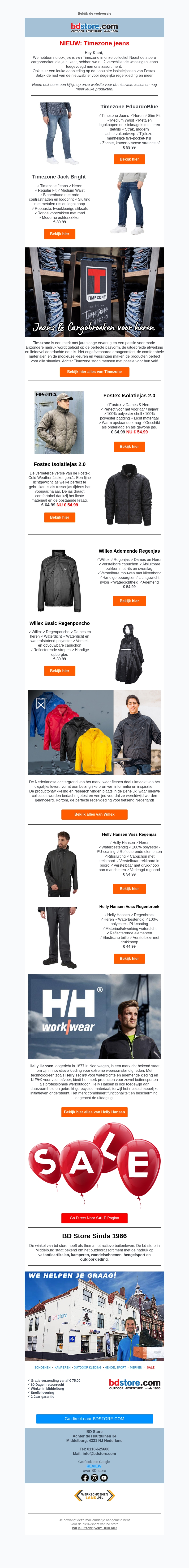 Dit seizoen introduceert BD Store de nieuwste jeans van Timezone. Ontdek stijlvolle modellen zoals de Timezone Edmond en Jack Bright. Profiteer nu van de speciale aanbiedingen op diverse herenkleding, inclusief comfortabele jassen van Foster en waterdichte regenkleding van Helly Hansen. Bezoek onze winkel en update je gardarobe met deze unieke stijlen.
