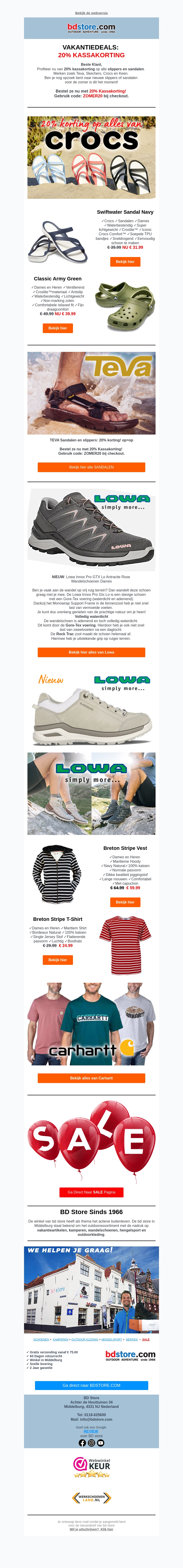 Geniet van 20% kassakorting op een breed assortiment slippers en sandalen bij BD Store. Bekende merken zoals Crocs, Teva en Lowa zijn nu extra voordelig. Mis deze kans niet en bereid je voor op de zomer! Gebruik de code ZOMER20 bij het afrekenen.