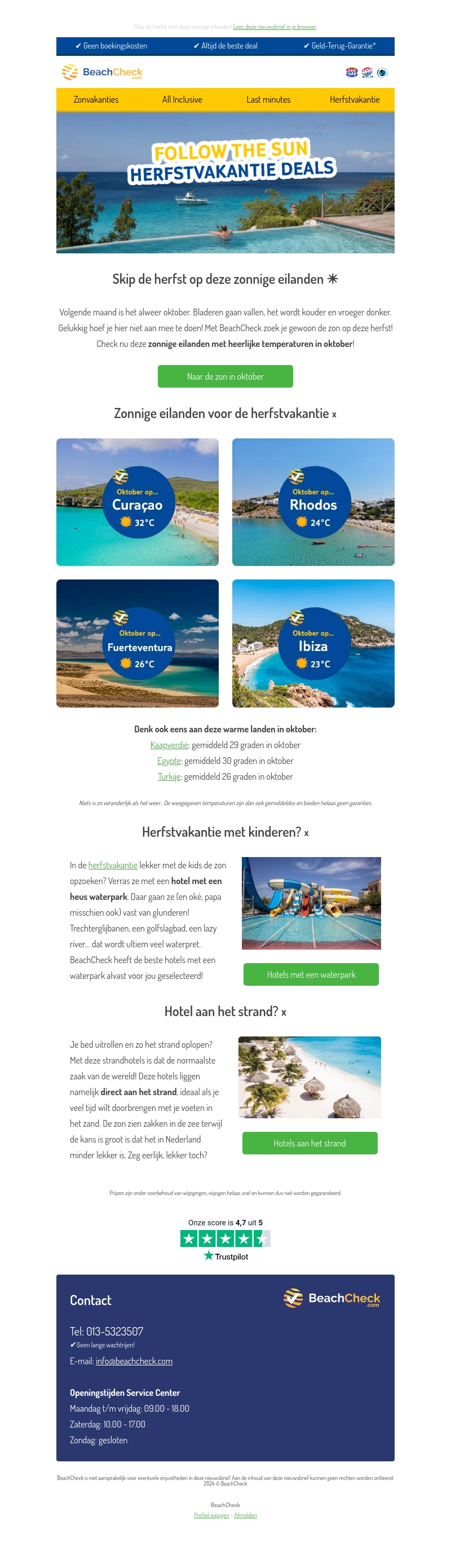 Ontsnap aan de kou en geniet van zonnige eilanden deze herfstvakantie met BeachCheck. Ontdek bestemmingen zoals Curaçao, Rhodos, Fuerteventura en Ibiza. Of verras de kinderen met een hotel met een waterpark. Ervaar de luxe van hotels direct aan het strand voor een onvergetelijke vakantie.