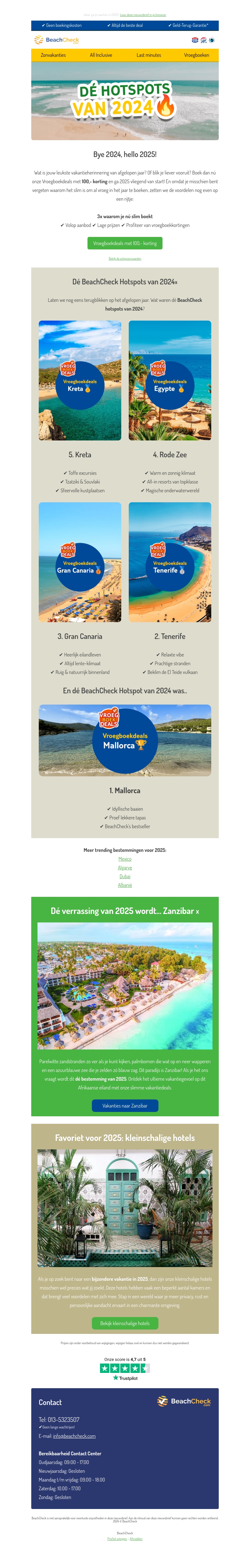 In deze nieuwsbrief presenteren we de meest populaire vakantiebestemmingen voor 2024, waaronder Kreta, de Rode Zee, Gran Canaria, Tenerife en de nummer één: Mallorca. Ontdek wat deze bestemmingen zo speciaal maakt en bereid je voor op jouw droomvakantie. Laat je verrassen door de trends voor 2025 waar Zanzibar in de spotlight staat. Voor wie houdt van intimiteit, bieden we ook kleinschalige hotelopties aan.