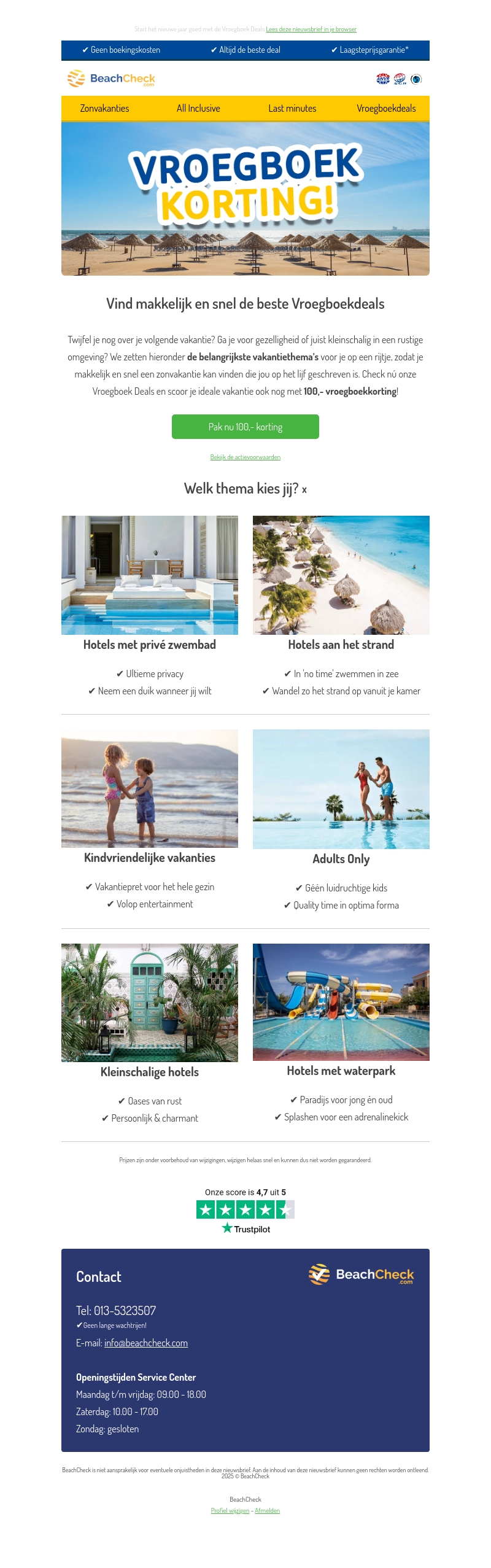 Twijfel je nog over je volgende vakantie? BeachCheck helpt je met de beste vroegboekdeals. Kies jouw favoriete vakantiethema en profiteer van β¬100 korting. Of je nu op zoek bent naar rust of avontuur, er is voor ieder wat wils.