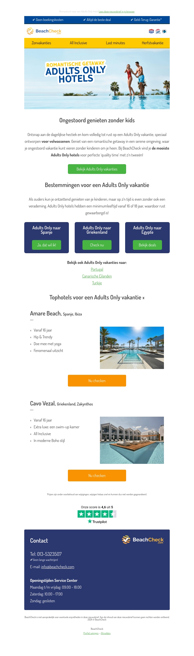 Ontsnap aan de dagelijkse hectiek en kom volledig tot rust met een Adults Only vakantie. Geniet van een serene omgeving zonder kinderen en beleef de mooiste tijd met z'n tweeΓ«n. Bekijk onze topselectie van Adults Only hotels in Spanje, Griekenland en Egypte.