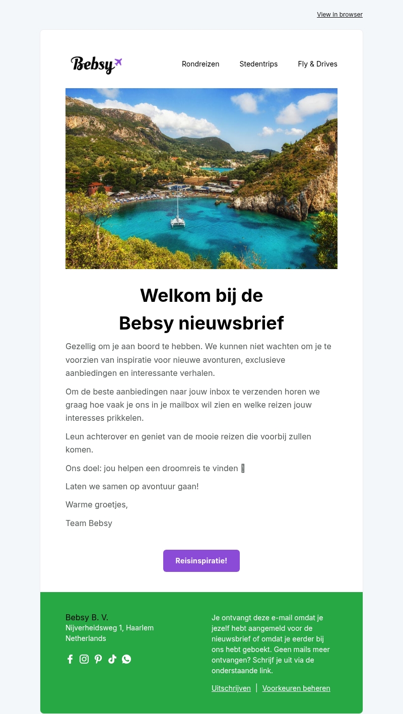 Gezellig dat je bij ons aan boord bent. Onze Bebsy nieuwsbrief is jouw toegang tot inspirerende reisverhalen en exclusieve aanbiedingen. Ontdek nieuwe avonturen en geniet van verrassende bestemmingen. We luisteren graag naar jouw voorkeuren en sturen de beste deals direct naar jouw inbox. Ons doel is om samen jouw droomreis te vinden. Laat het avontuur beginnen!