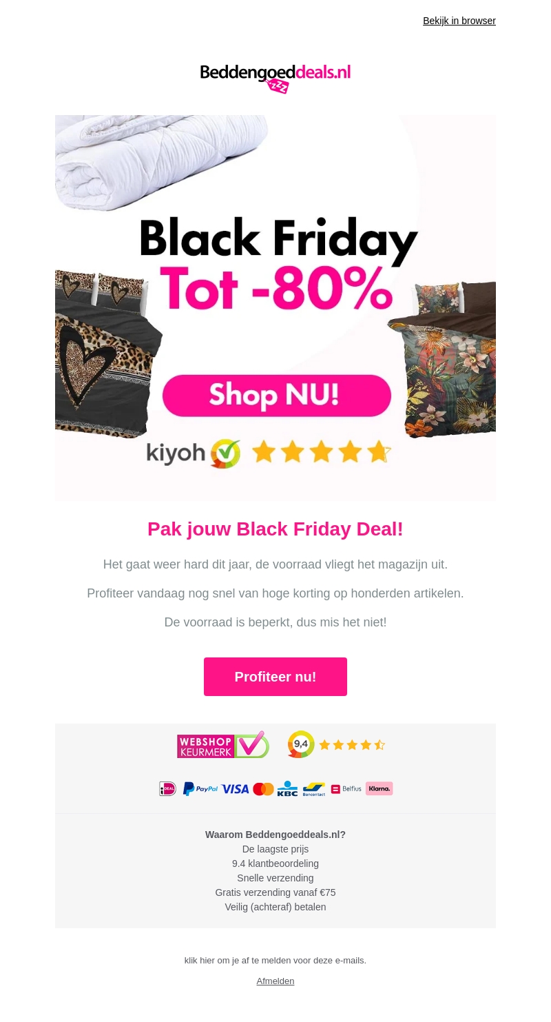 Black Friday is hier bij Beddengoeddeals.nl met kortingen tot wel 80%! Ontdek ons assortiment aan beddengoed en profiteer snel. De voorraad is beperkt en gaat hard. Mis deze kans niet om geweldige deals te scoren.