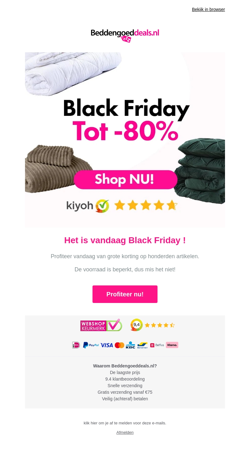 Het is vandaag Black Friday bij Beddengoeddeals.nl! Profiteer van kortingen tot 80% op een breed assortiment beddengoed. De voorraad is beperkt, dus mis het niet! Geniet van de laagste prijzen, snelle verzending, en gratis verzending vanaf €75.