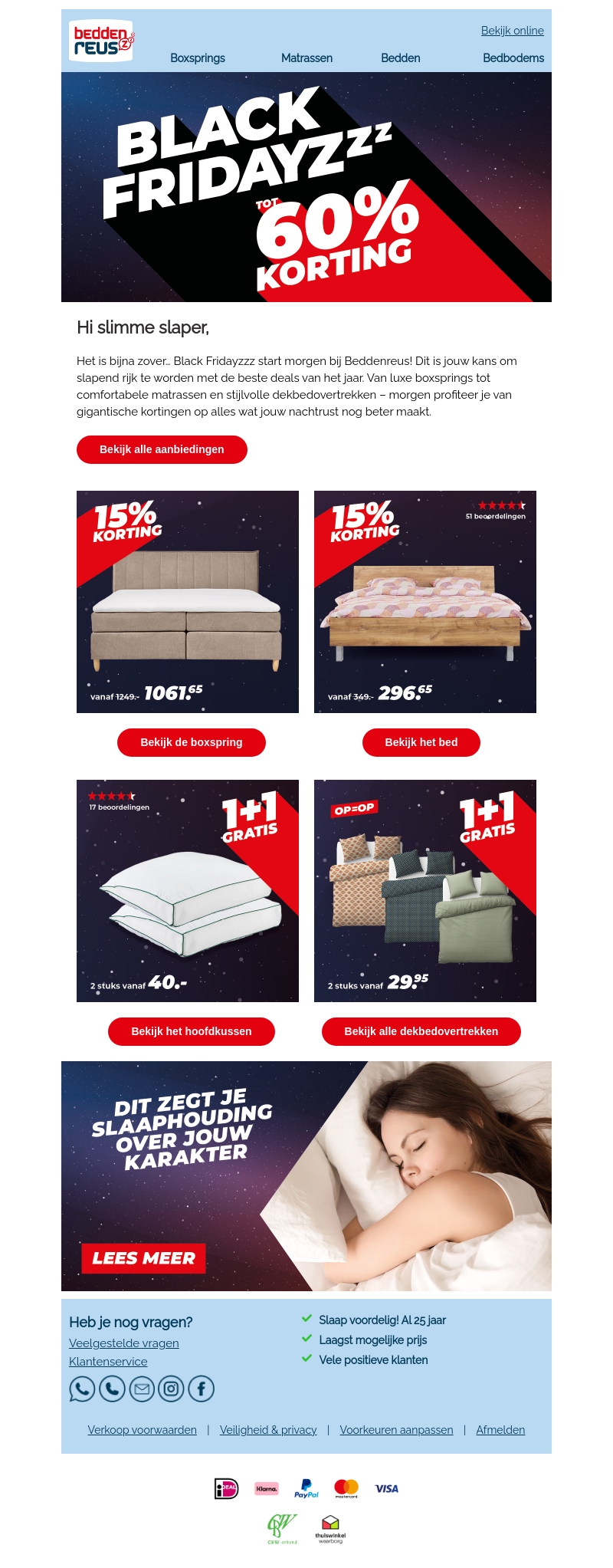 Het is bijna zover... Black Fridayzzz start morgen bij Beddenreus! Profiteer van de grootste kortingen op luxe boxsprings, matrassen en dekbedovertrekken. Mis je kans niet om slapend rijk te worden met deze geweldige deals!