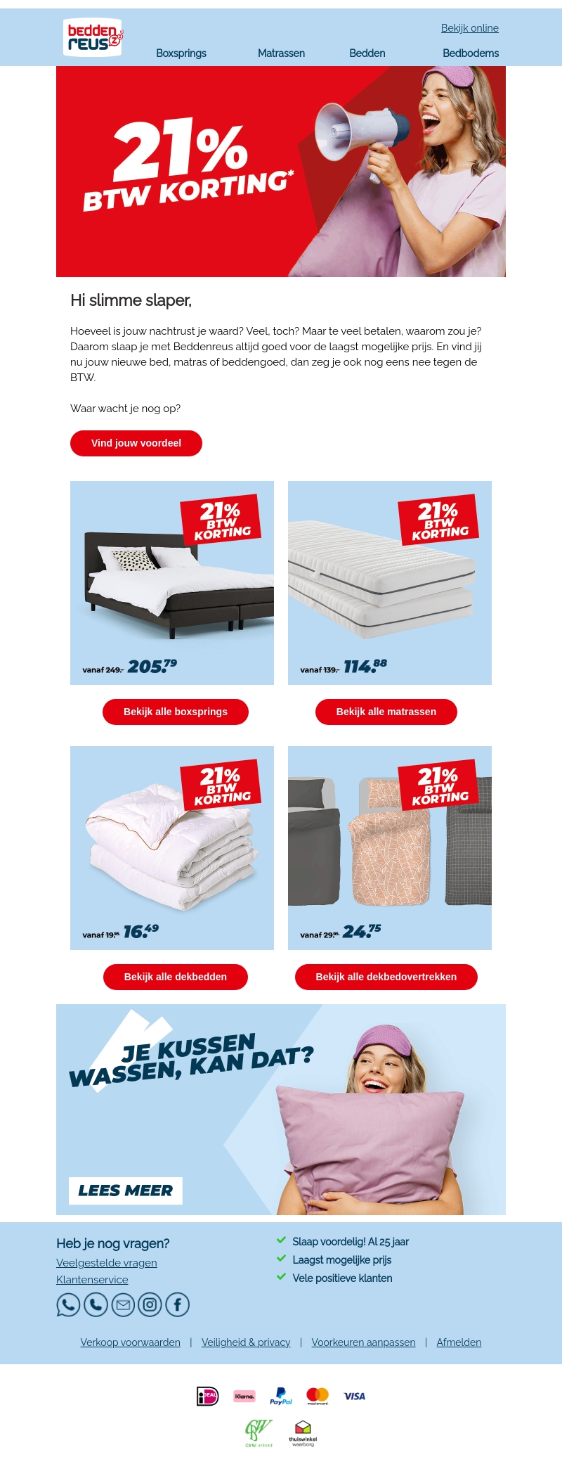 Hi slimme slaper, waarom zou je teveel betalen voor een goede nachtrust? Bij Beddereus ontvang je nu 21% BTW korting op bedden, matrassen en beddengoed. Grijp deze kans en slaap heerlijk tegen de laagst mogelijke prijs!