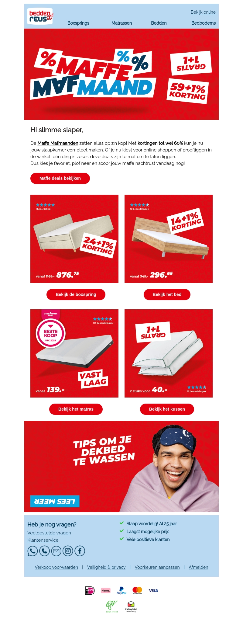 De Maffe Mafmaanden zijn begonnen! Ontdek spectaculaire kortingen tot wel 60% bij Beddenreus. Of je nu online shopt of in de winkel, deze deals zijn gek om te missen. Maak jouw slaapkamer compleet met onze scherpe aanbiedingen op boxsprings, bedden, matrassen en kussens. Kijk snel en geniet van een waanzinnige nachtrust voor minder!