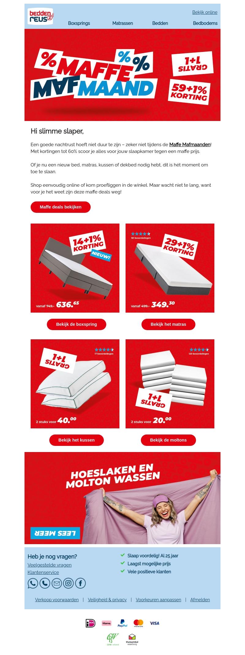 Slaap slimmer en voordeliger met de Maffe Mafmaanden van Beddenreus! Geniet van spectaculaire kortingen tot wel 60% op diverse producten voor jouw slaapkamer. Of je nu op zoek bent naar een nieuw bed, matras, kussen of dekbed, dit is hÊt moment om te besparen. Mis deze maffe deals niet en shop nu online of in de winkel. Wacht niet te lang want op is op!