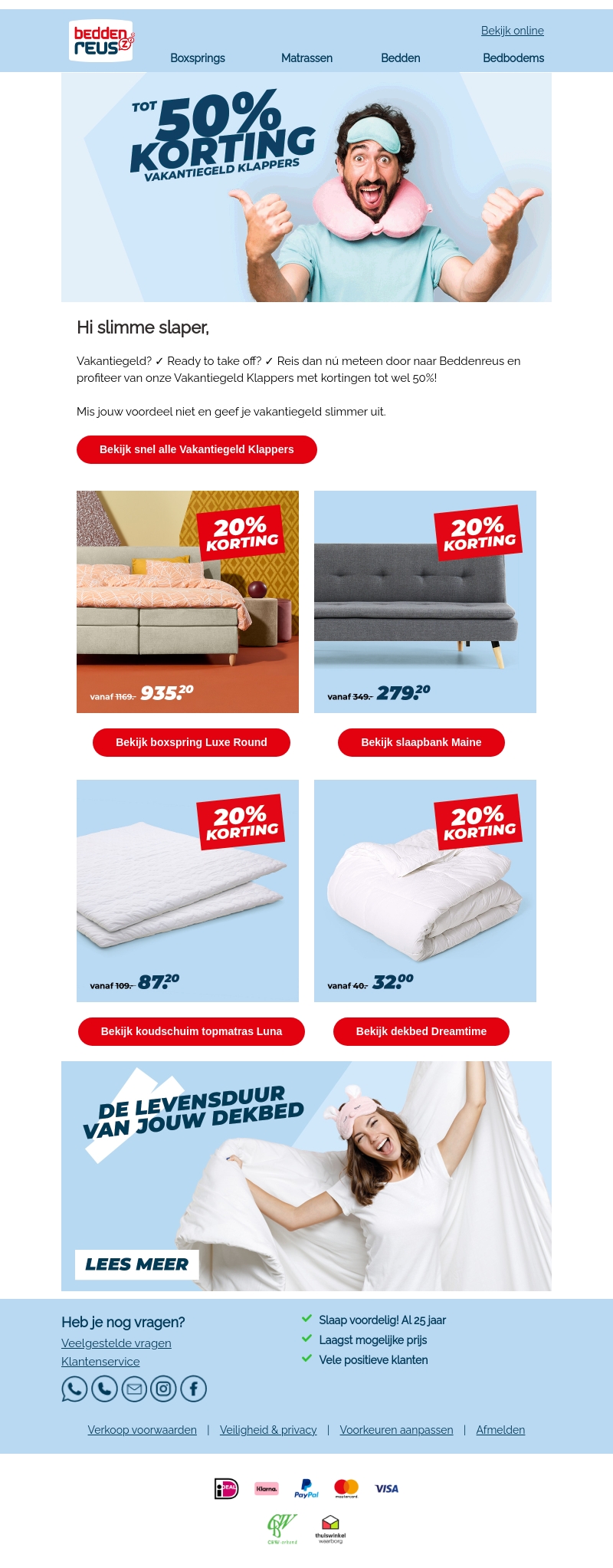 Hi slimme slaper! Gebruik je vakantiegeld verstandig en bespaar flink bij Beddenreus. Ontdek onze Vakantiegeld Klappers en geniet van kortingen tot wel 50%. Bekijk boxsprings, slaapbanken, topmatrassen en dekbedden met gaten in de prijzen. Mis het niet en upgrade je slaapkamer vandaag nog.