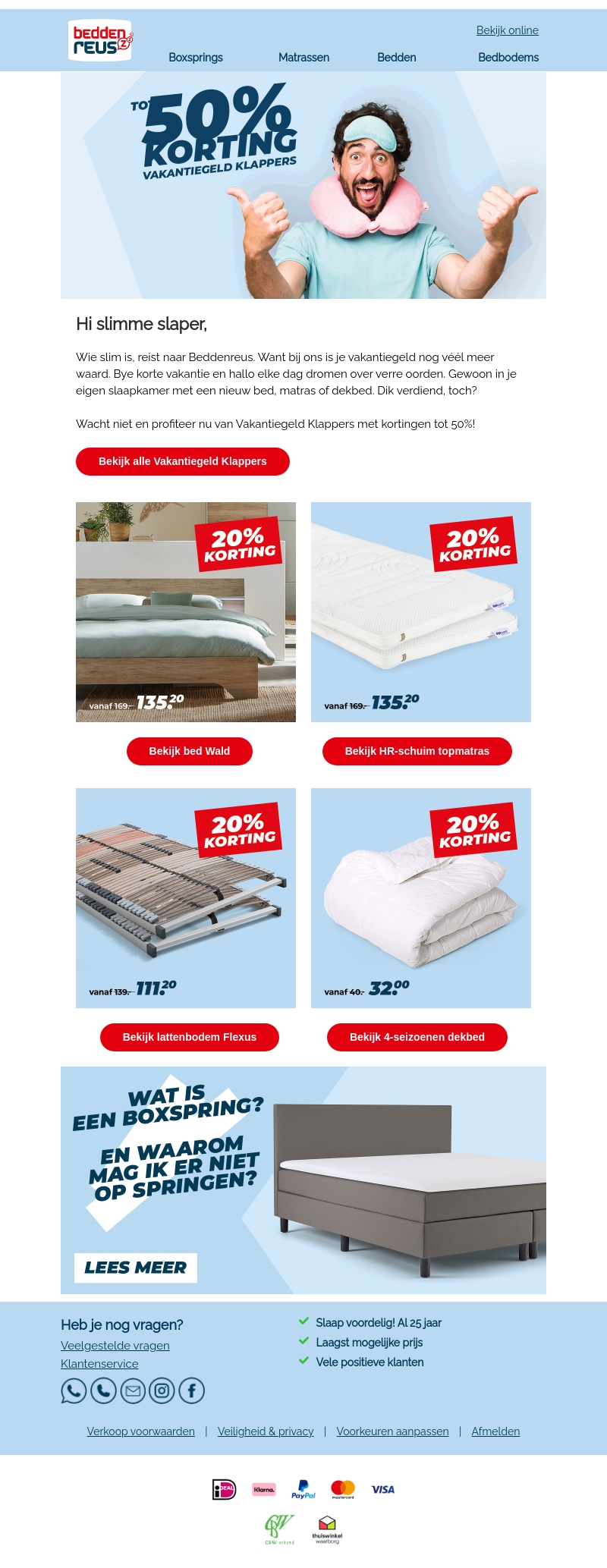 Hi slimme slaper, je vakantiegeld levert nu meer op bij Beddenreus! Ontvang tot 50% korting op bedden, matrassen en andere slaapkamer must-haves met onze Vakantiegeld Klappers. Mis deze kans niet en update je slaapkamer met geweldige aanbiedingen!