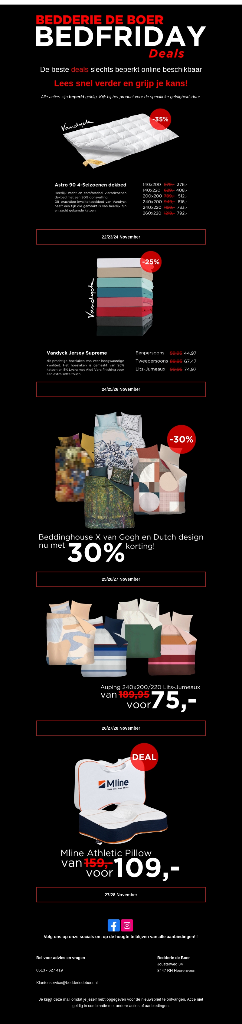 Bedderie de Boer presenteert BedFriday Deals met enorme kortingen op diverse producten. Profiteer van de beste aanbiedingen voor dekbedden, hoeslakens en meer. Kortingen tot wel 35% en speciale aanbiedingen met datums. Ontdek Vandyck en Beddinghouse samenwerkingen met unieke designs. Mis de deals niet en verbeter je slaapcomfort. Enkele aanbiedingen zijn slechts beperkt online beschikbaar.