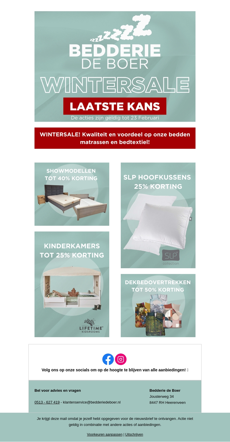 Mis niet de Wintersale bij Bedderie de Boer! Geniet van kortingen tot wel 50% op een breed scala aan producten, waaronder showmodellen en kinderkamers. Deze speciale aanbiedingen zijn nog geldig tot 23 februari. Zorg dat je erbij bent en vernieuw je slaapkamer met kwaliteitsproducten voor de beste prijs. Bezoek ons op sociale media voor meer updates en exclusieve deals.