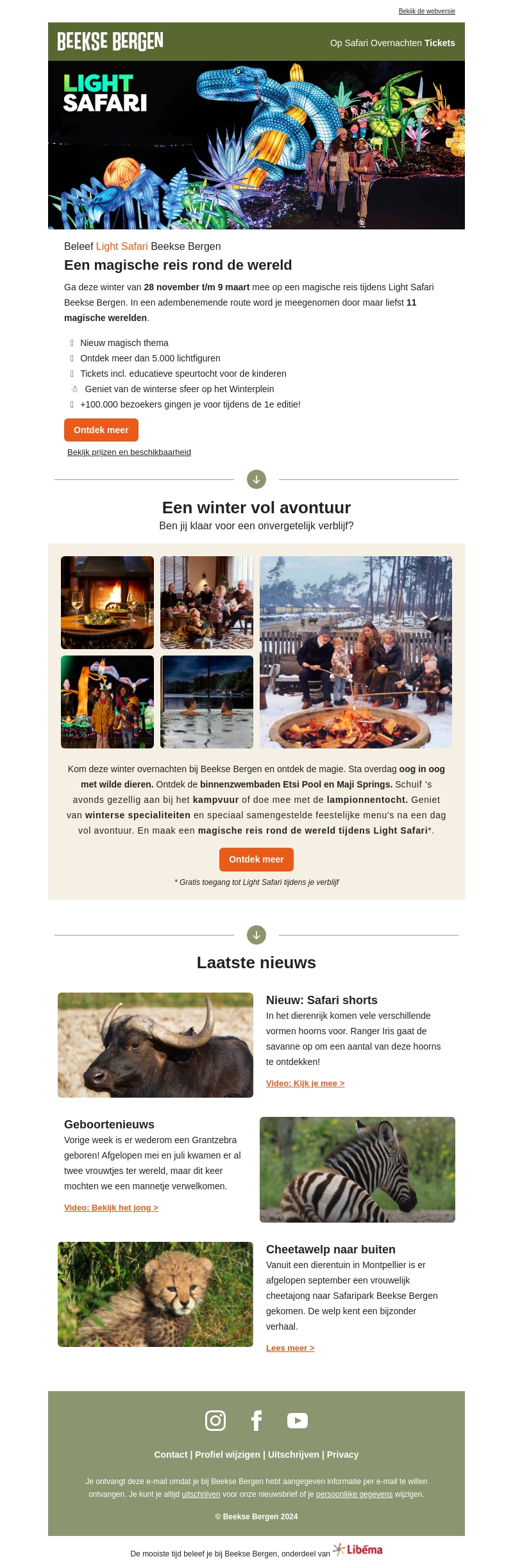 Ga mee op een magische reis tijdens de Light Safari Beekse Bergen. Van 28 november t/m 9 maart word je meegenomen door 11 unieke werelden met meer dan 5.000 lichtfiguren. Geniet van winterse activiteiten zoals kampvuren en speciale feestmenu's. Dit onvergetelijke avontuur is ideaal voor het hele gezin.
