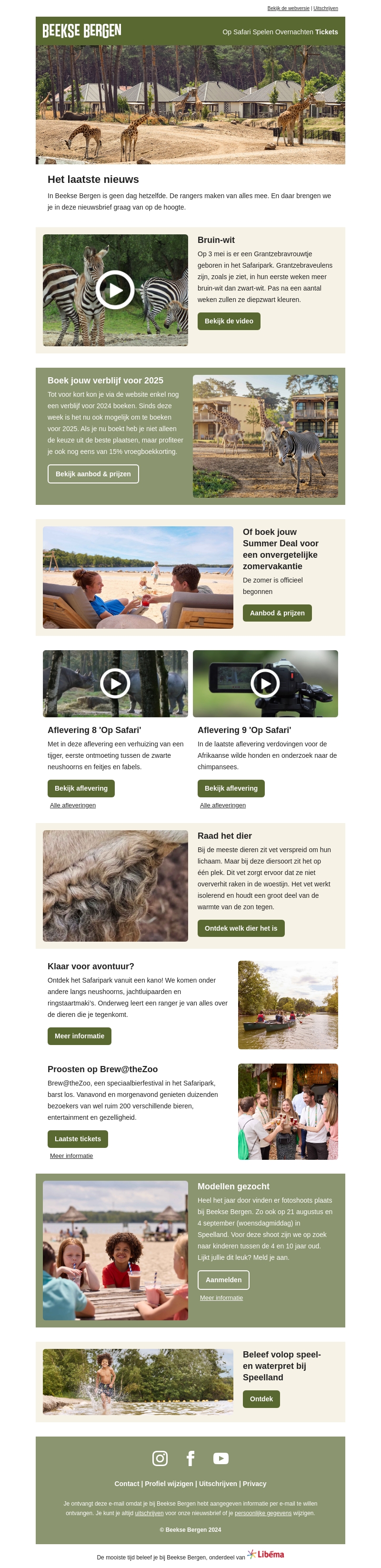 In deze nieuwsbrief brengen we je op de hoogte van het laatste nieuws bij Beekse Bergen. Ontdek de geboorte van een bruin-wit zebra veulen, boek je verblijf voor 2025 en bekijk de nieuwste afleveringen van 'Op Safari'. Ben jij klaar voor een nieuw avontuur? Ontdek het nu!