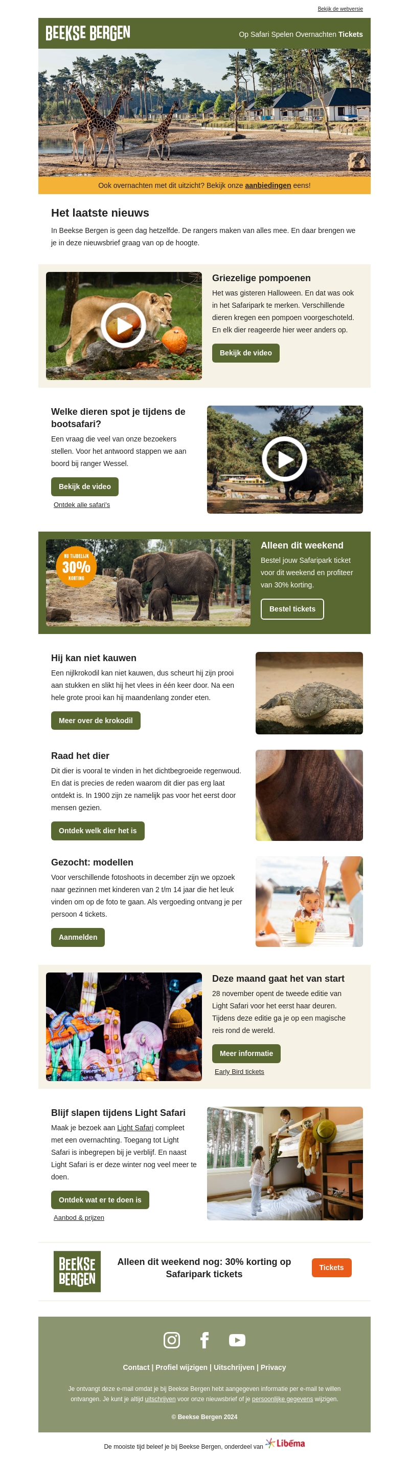 Ontdek de nieuwste avonturen bij Beekse Bergen! Geniet van Halloween met enge pompoenen, verken de wonderen van de bootsafari en raad het mysterieuze dier. Maak kans op 30% korting op je weekendbezoek en beleef de magie van de Light Safari.