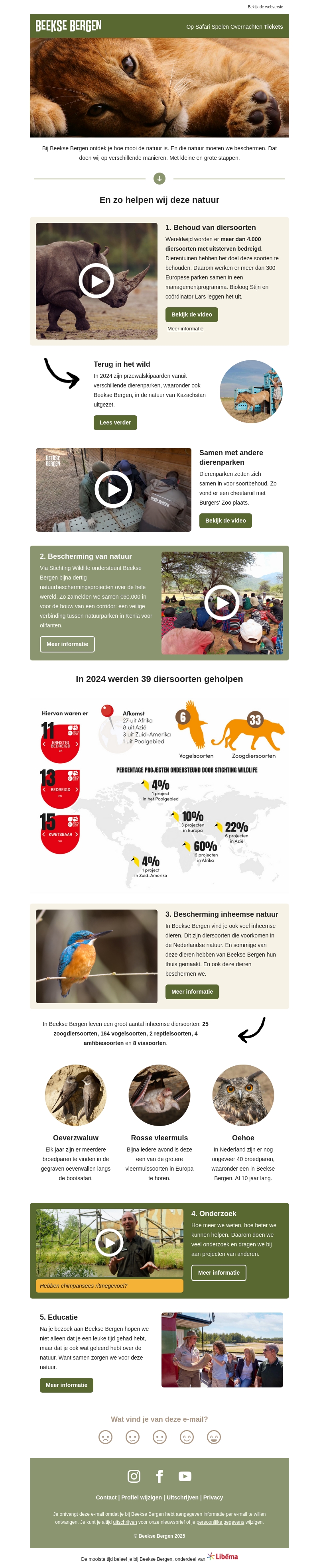 Bij Beekse Bergen maken we ons sterk voor de bescherming van natuur en dier. Door internationale samenwerkingen en lokale initiatieven zorgen we voor het behoud van bedreigde diersoorten. Met educatie en onderzoek willen we bewustzijn vergroten. Samen streven we naar een betere toekomst voor mens en dier.