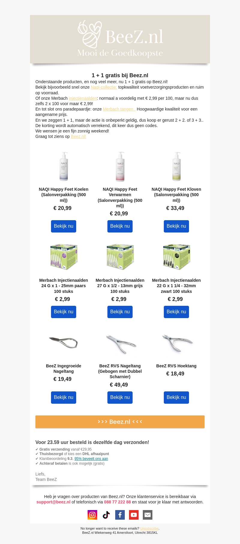 Ontdek de geweldige 1 + 1 gratis actie bij Beez.nl! Bestel bijvoorbeeld de Naqi voetverzorgingsproducten of de voordelige Merbach injectienaalden en tangsets. De actie is onbeperkt geldig, dus sla je slag terwijl de voorraad strekt. Ga snel naar Beez.nl en profiteer van deze unieke aanbiedingen!