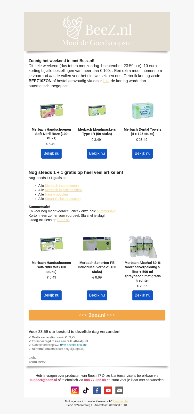 Zonnig het weekend in met Beez.nl! Ontvang €10 korting bij bestellingen van meer dan €100,-. Gebruik de kortingscode BEEZ10ZON en winkel de hele zomer voordelig. Bekijk onze 1+1 gratis aanbiedingen en zomersale voor nog meer voordeel. Bestel voor 23:59 uur en ontvang je bestelling de volgende dag.