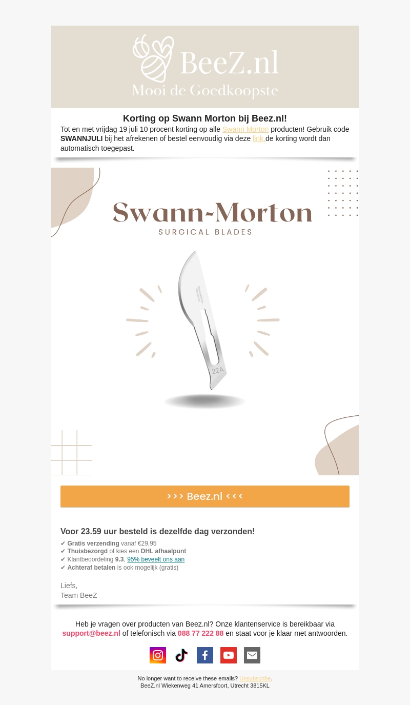 Tot en met vrijdag 19 juli ontvang je 10% korting op alle Swann Morton producten bij BeeZ.nl. Gebruik de code SWANNJULI bij het afrekenen. Bestel voor 23:59 uur en je bestelling wordt dezelfde dag verzonden. Gratis verzending vanaf €29,95.