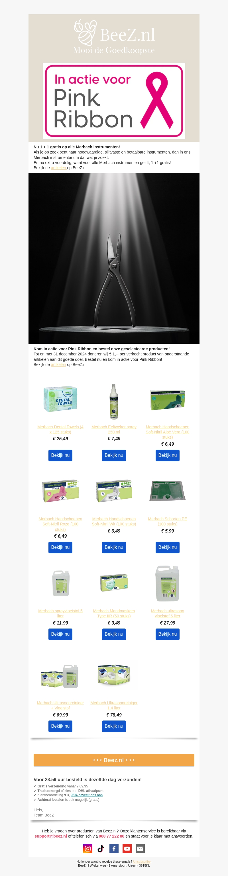 Ontdek de 1+1 gratis actie op alle Merbach instrumenten bij BeeZ.nl. Dit is het moment om je instrumentenvoorraad aan te vullen. Daarnaast steun je Pink Ribbon met elke aankoop. Profiteer van deze speciale aanbieding en draag bij aan een goed doel. Bestel vandaag nog en maak gebruik van de snelle levering. Mis deze kans niet!
