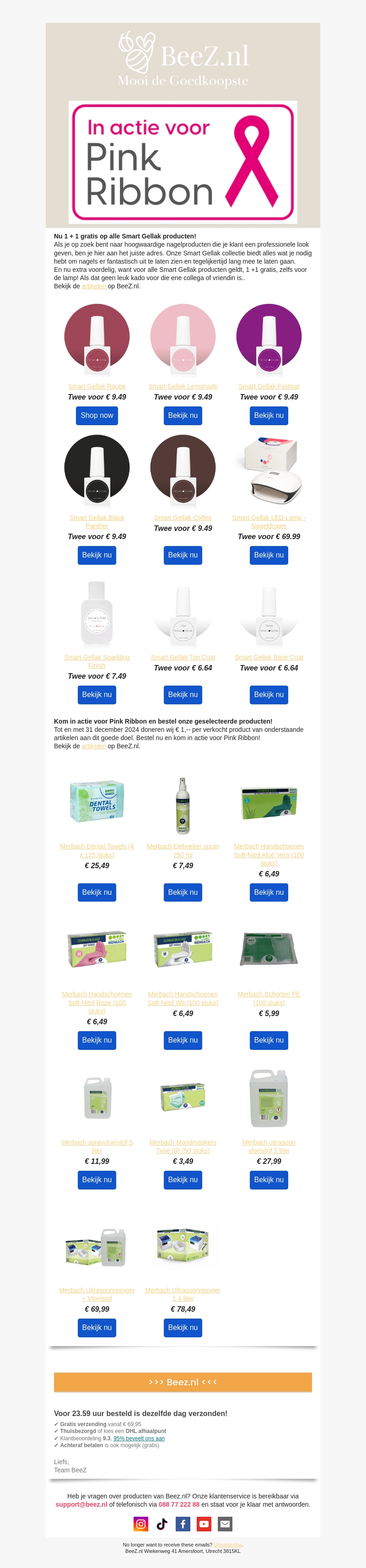 BeeZ.nl biedt een fantastische 1+1 gratis actie op alle Smart Gellak producten. Deze collectie heeft alles voor een perfecte nagellook. Ontdek de prachtige kleuren zoals Rouge, Lemonade, en Festival. Bovendien draag je bij aan Pink Ribbon. Bekijk de actie snel en geniet van een gratis verzending bij bestellingen voor 23.59 uur!