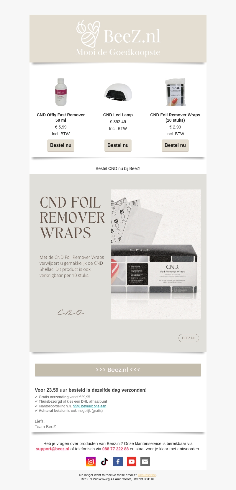 Verwen jezelf met de nieuwste CND producten bij BeeZ. Ontdek de CND Offly Fast Remover, de CND Led Lamp en de handige CND Foil Remover Wraps. Bestel nu en profiteer van snelle verzending en betrouwbare service.